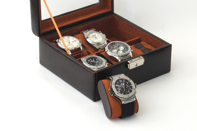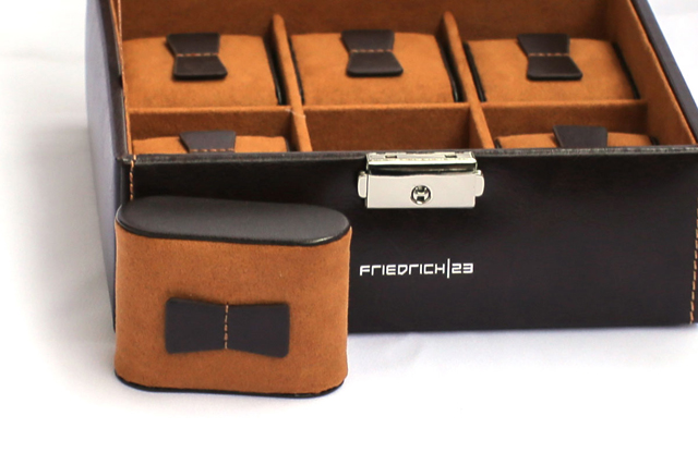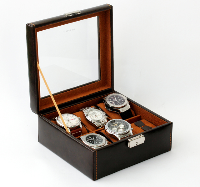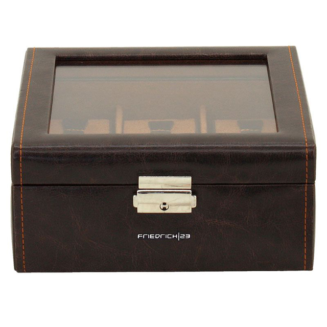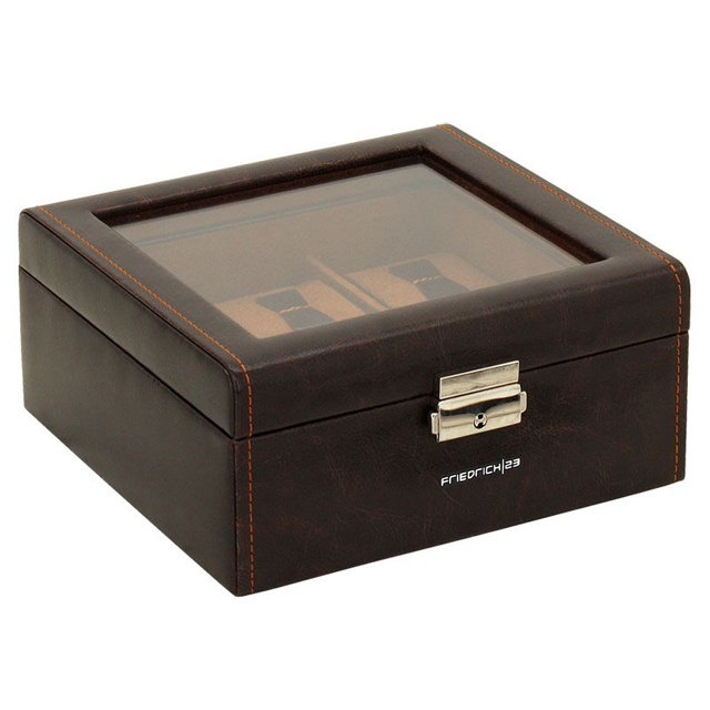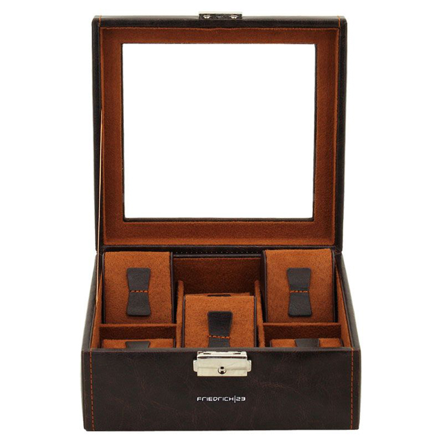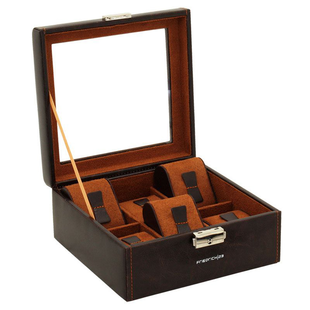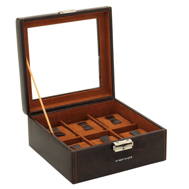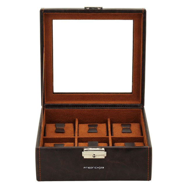 Pudełko ( etui) skórzane na 6 zegarków z dużym przeszkleniem- skóra ekologiczna brązowa. Bond Collection. Produkcja niemiecka- Friedrich/23. Perfekcyjna jakość wykonania. Duże, miękkie i idealnie spasowane poduszki pod zegarki. To pudełko zapewni Tobie również piękną prezentację kolekcji. |