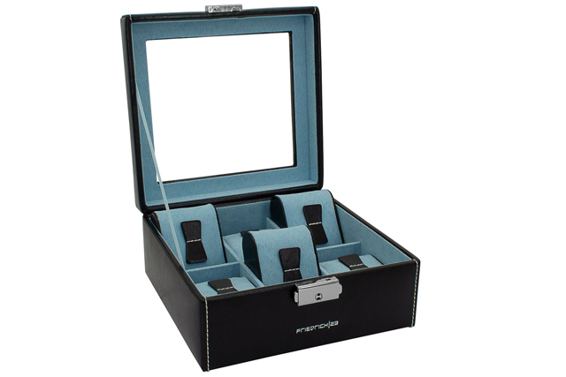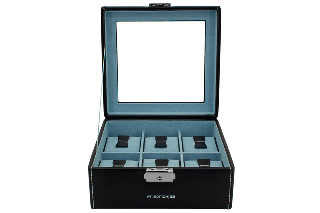 Pudełko ( etui) skórzane na 6 zegarków z dużym przeszkleniem- skóra ekologiczna czarna. Bond Collection. Produkcja niemiecka- Friedrich/23. Perfekcyjna jakość wykonania. Duże, miękkie i idealnie spasowane poduszki pod zegarki. To pudełko zapewni Tobie również piękną prezentację kolekcji. |