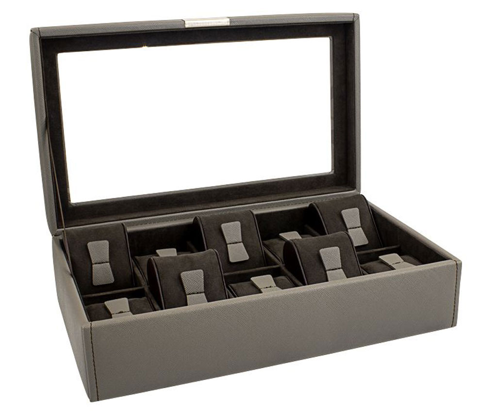 Pudełko wykonane z wielką dbałością o szczegóły, stanowi idealne miejsce do przechowywania zegarków. Bardzo kompaktowe ( nie zabiera dużo miejsca), odpowiednio usztywnione stanowi idealne miejsce do przechowywania zegarków. Miękkie i duże poduszki pozwalają na wpięcie zegarków o obwodzie paska od 18 cm a po ściśnięciu nawet poniżej 13 cm. Ponadto: