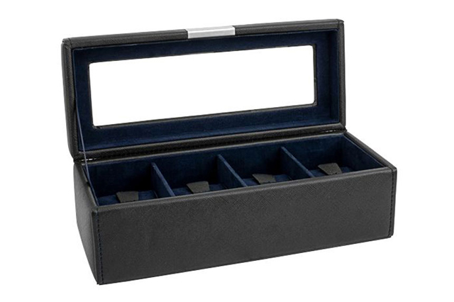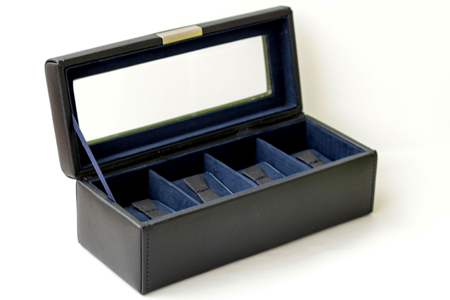 Pudełko ( etui) skórzane na 4 zegarki z dużym przeszkleniem- skóra ekologiczna z przeplotem krzyżowym. Cross Grain Collection. Czarne. Produkcja niemiecka- Friedrich/23. Perfekcyjna jakość wykonania. To pudełko zapewni Tobie również piękną prezentację kolekcji. |