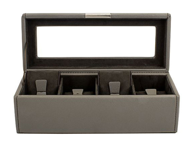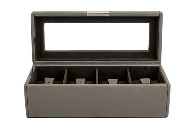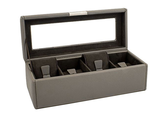 Pudełko ( etui) skórzane na 4 zegarki z dużym przeszkleniem- skóra ekologiczna z przeplotem krzyżowym. Cross Grain Collection. Taupe. Produkcja niemiecka- Friedrich/23. Perfekcyjna jakość wykonania. To pudełko zapewni Tobie również piękną prezentację kolekcji. |
