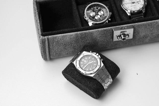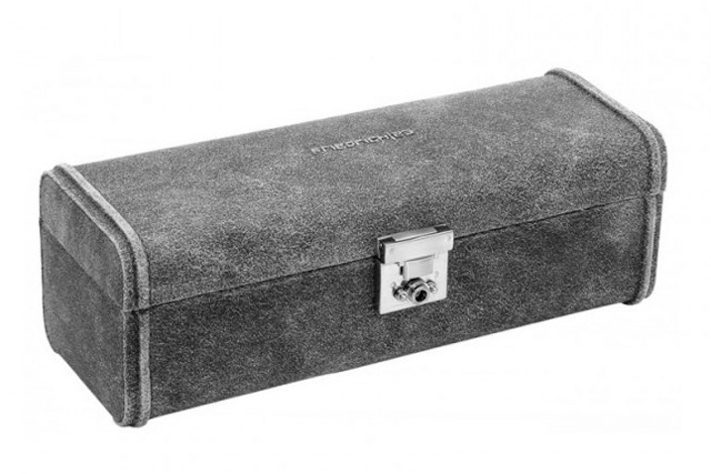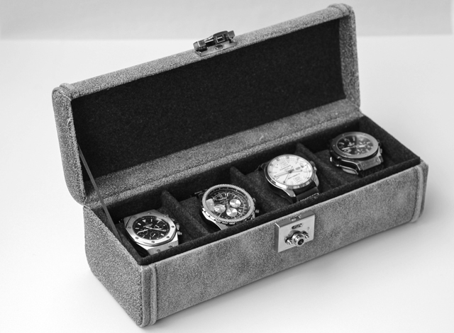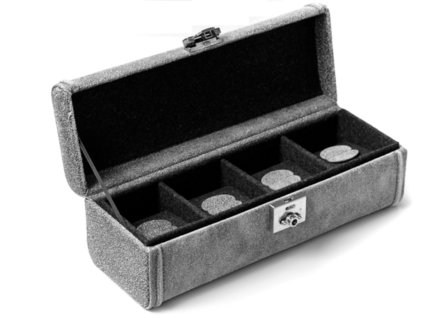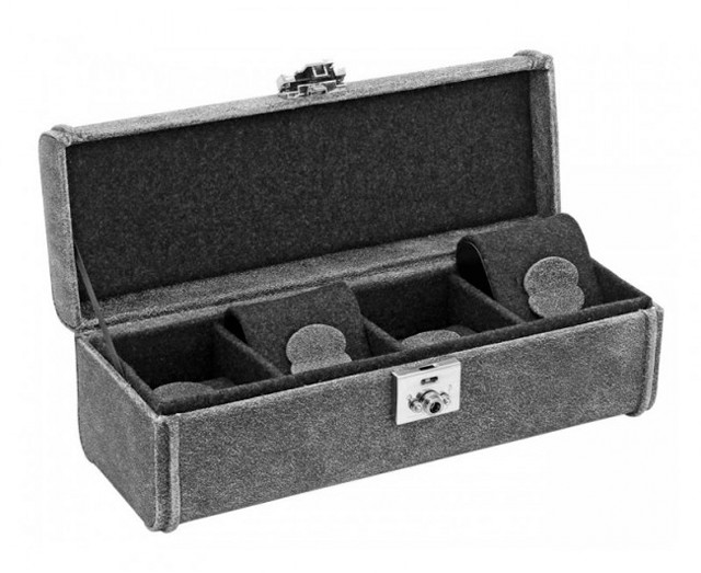 Luksusowe pudełko ( etui) skórzane na 4 zegarki - prawdziwa skóra naturalna (przecierana - patynowana). Produkcja niemiecka. Kolor szary.. Perfekcyjna jakość wykonania. 1 rok gwarancji ! Duże, dobrze spasowane poduszki o obwodzie 19,5 cm a po ściśnięciu można wpiąć paski o obwodzie 16 cm. |