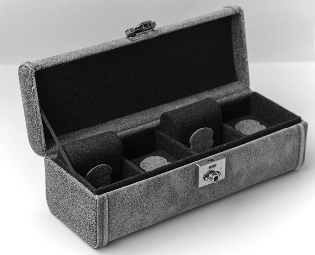 Pudelko wykonane ręcznie na bardzo wysokim poziomie artystycznym. Starannie skomponowane wnętrze, pomimo niewielkich rozmiarów pomieści 4 zegarki, również zegarki kieszonkowe ( do 6,5 cm). Duża głebokość przegródki ( 6 cm) oraz odpowiedniej wielkości miękkie poduszki wyznaczają nowy, większy standard bezpieczeństwa przechowywania. Zdjęcia real, przedstawiają licytowaną etui.Kliknij je dla powiększenia.
