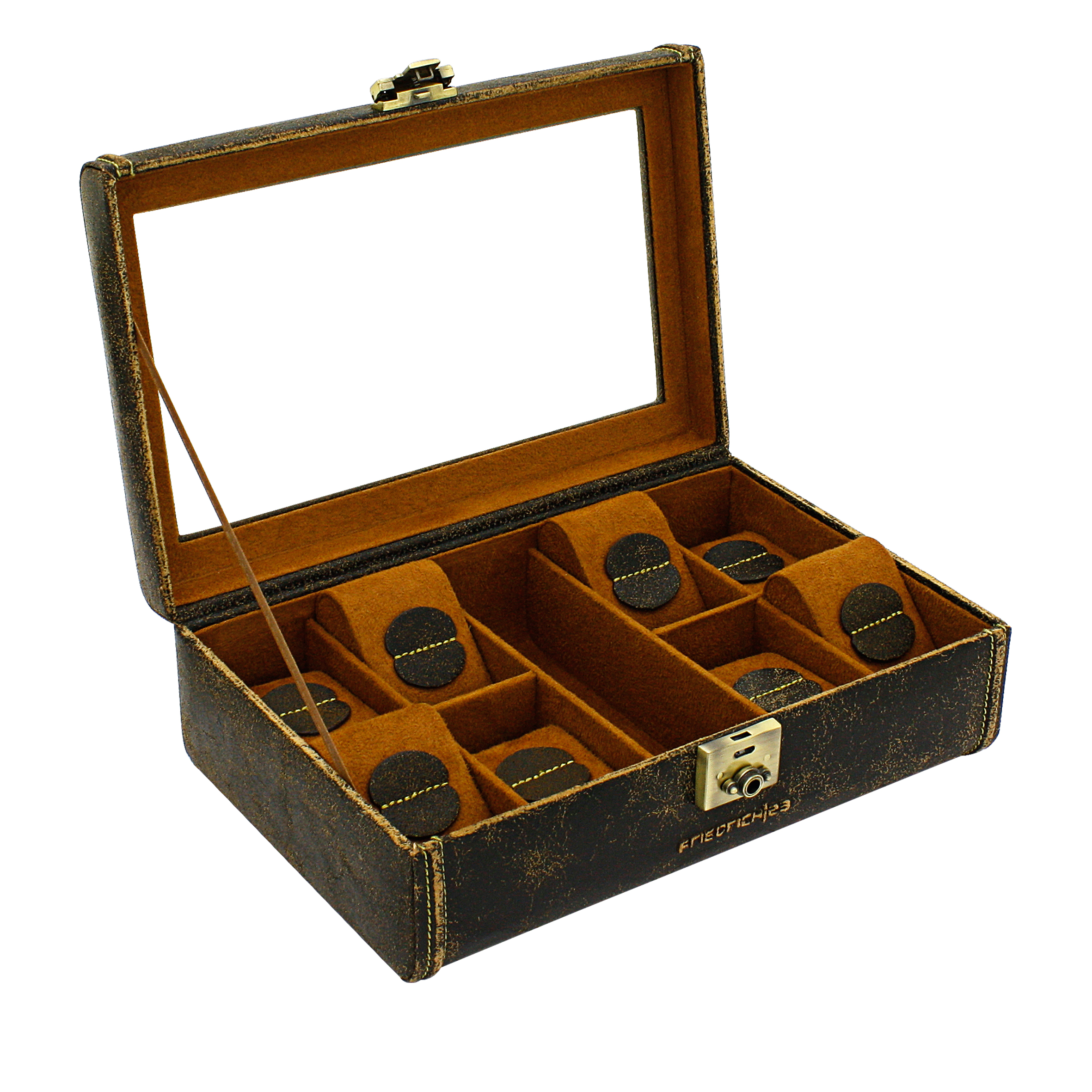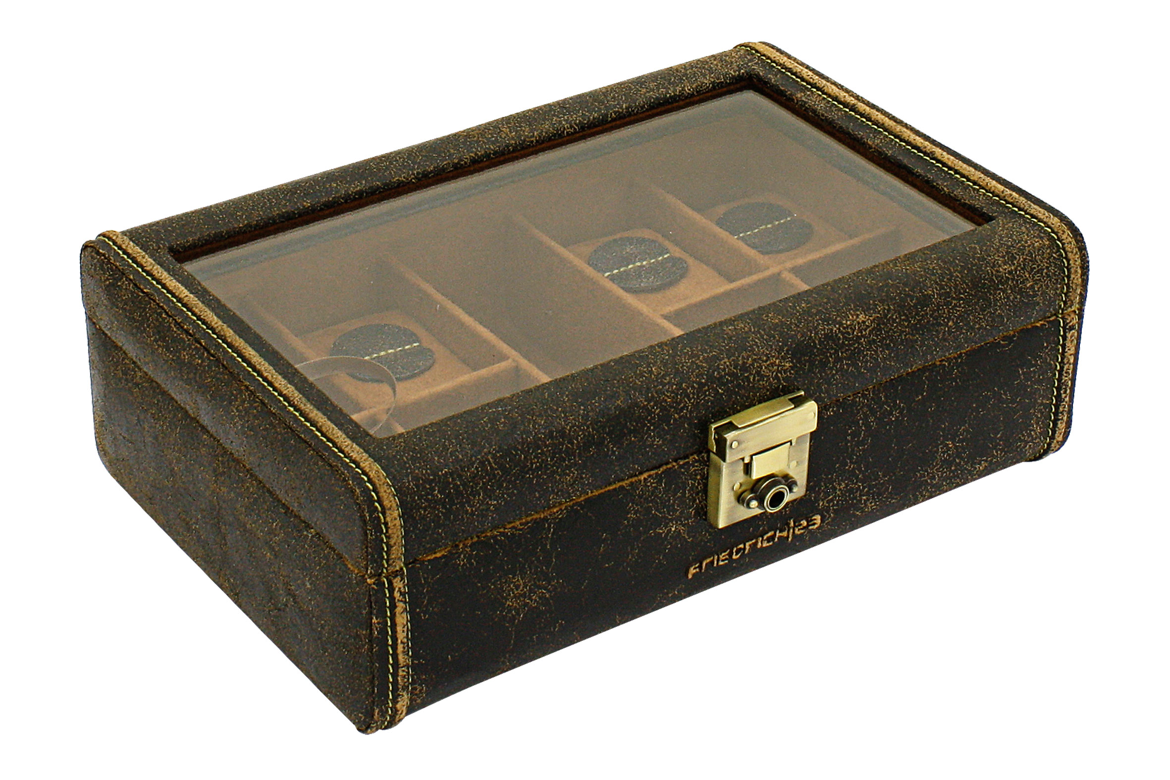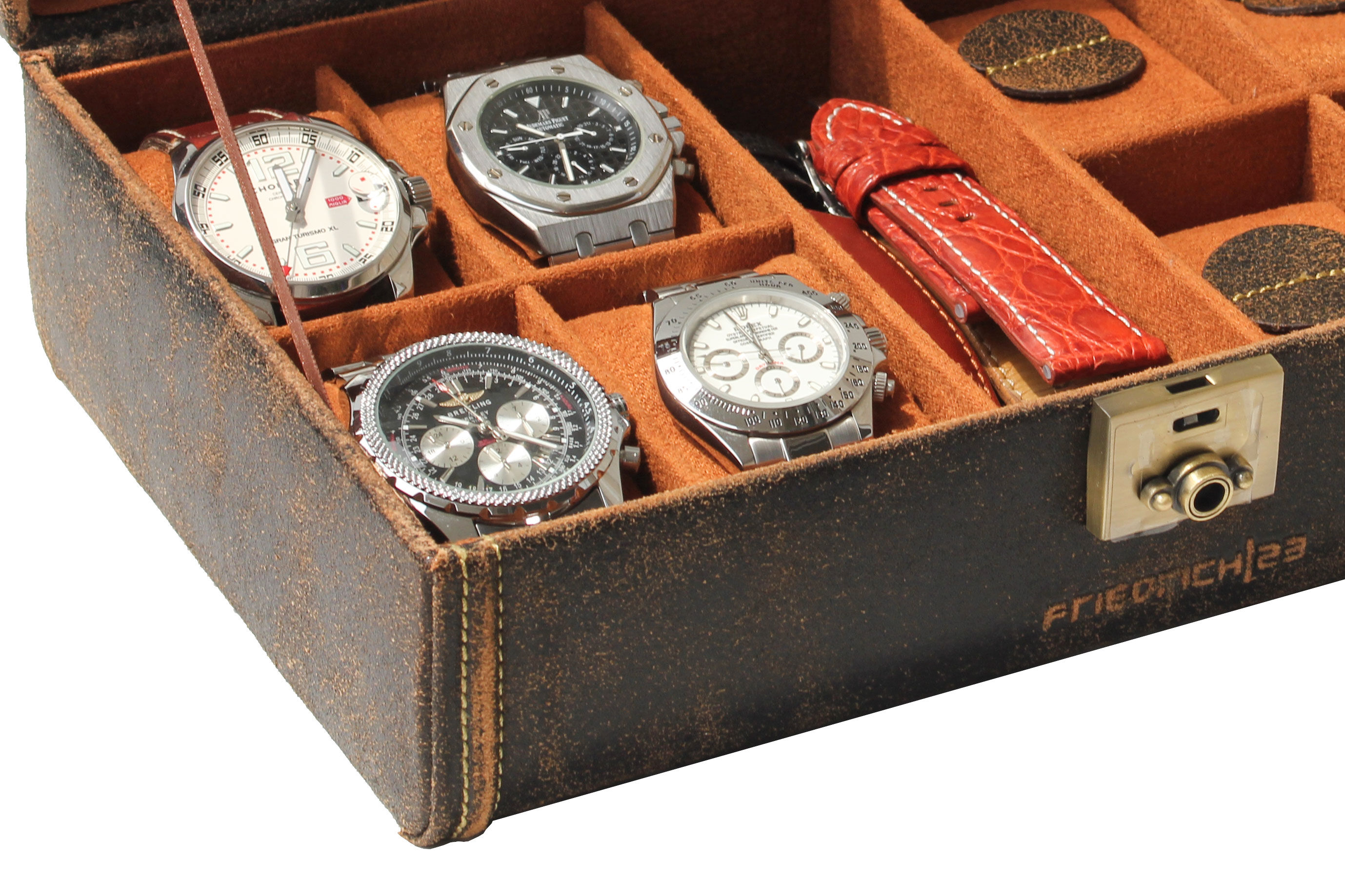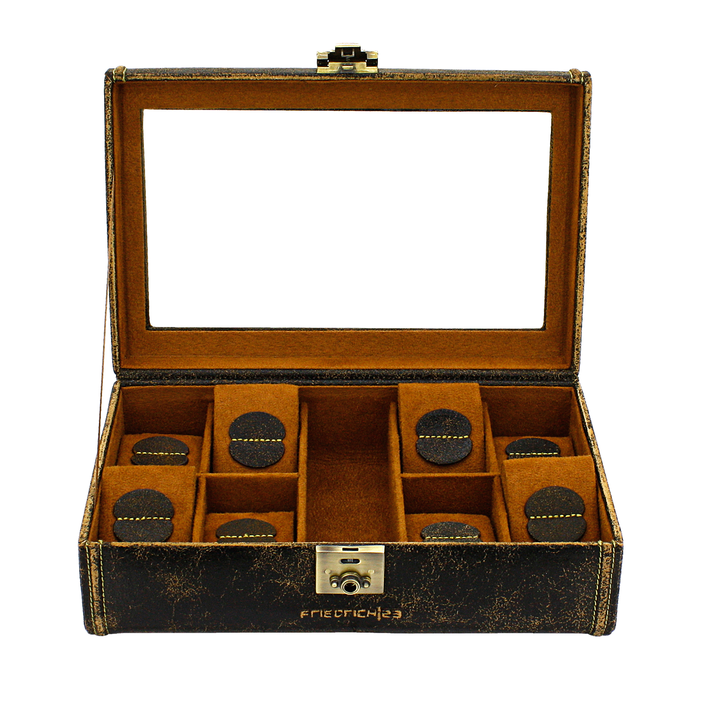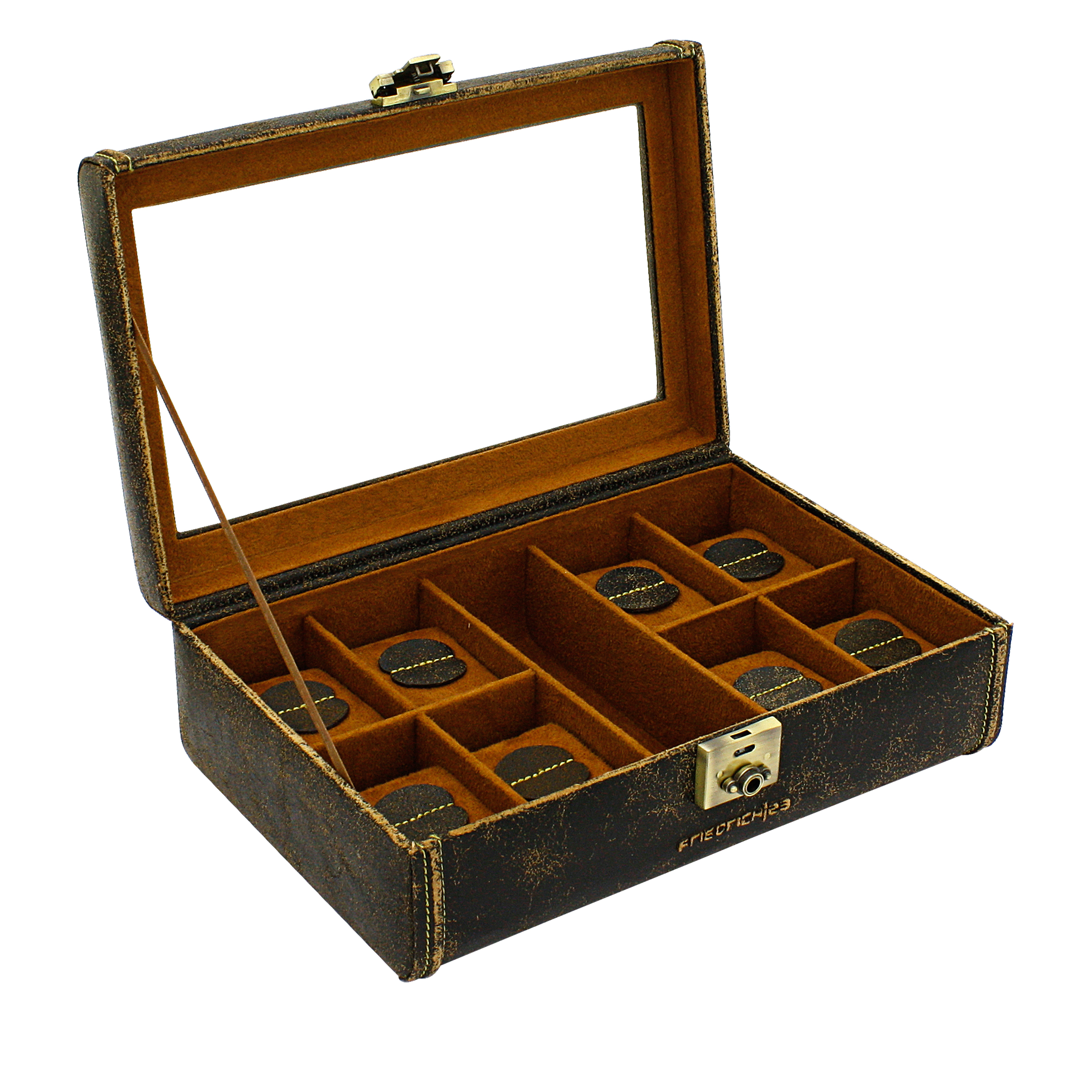 Luksusowe pudełko ( etui) skórzane na 8 zegarków z przeszkleniem ( witryna) + przegródka na paski i inne akcesoria. Skóra naturalna (przecierana - patynowana) o szorstkiej powierzchni w pięknym stylu Vintage. Ciemny brąz.